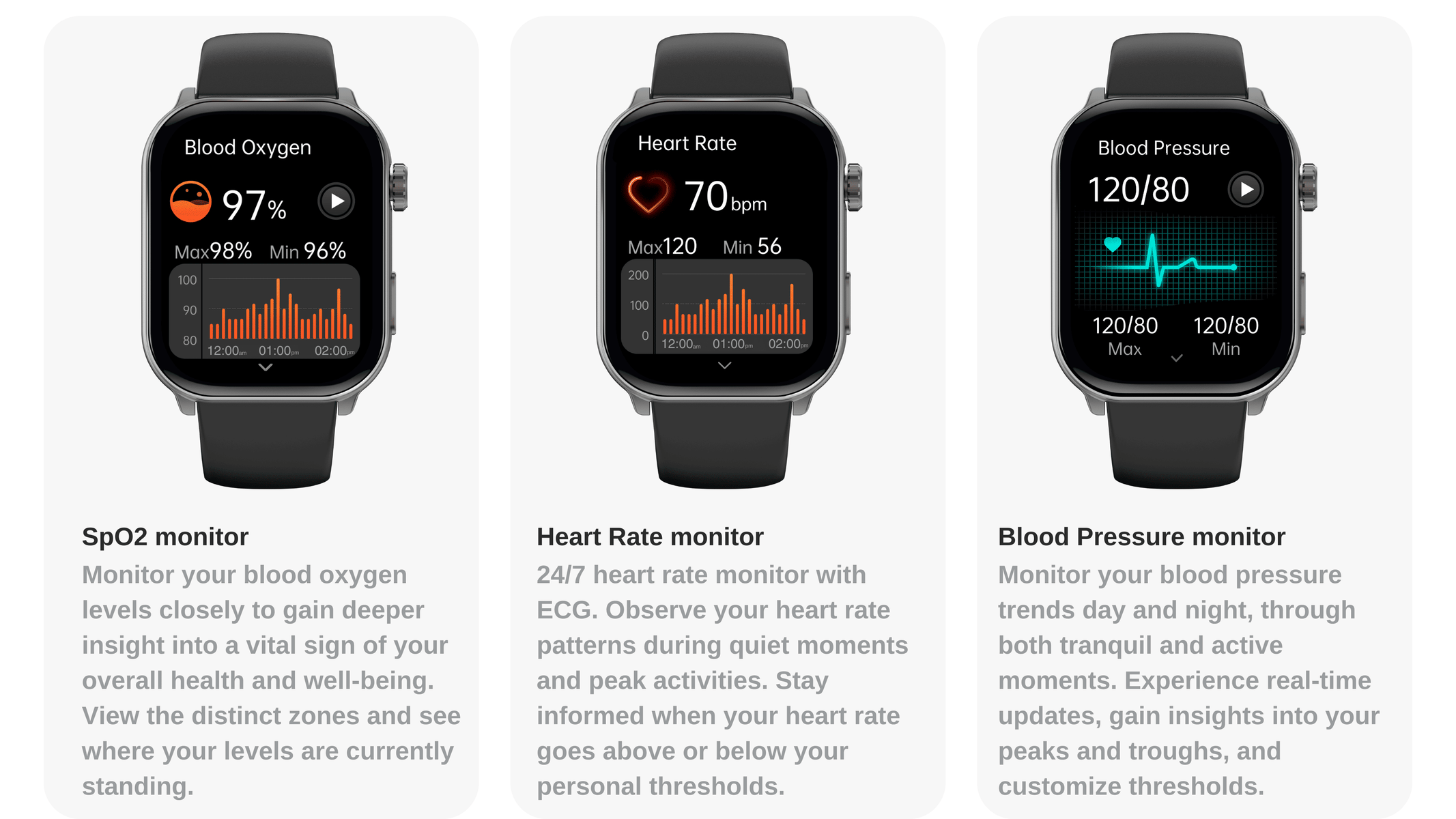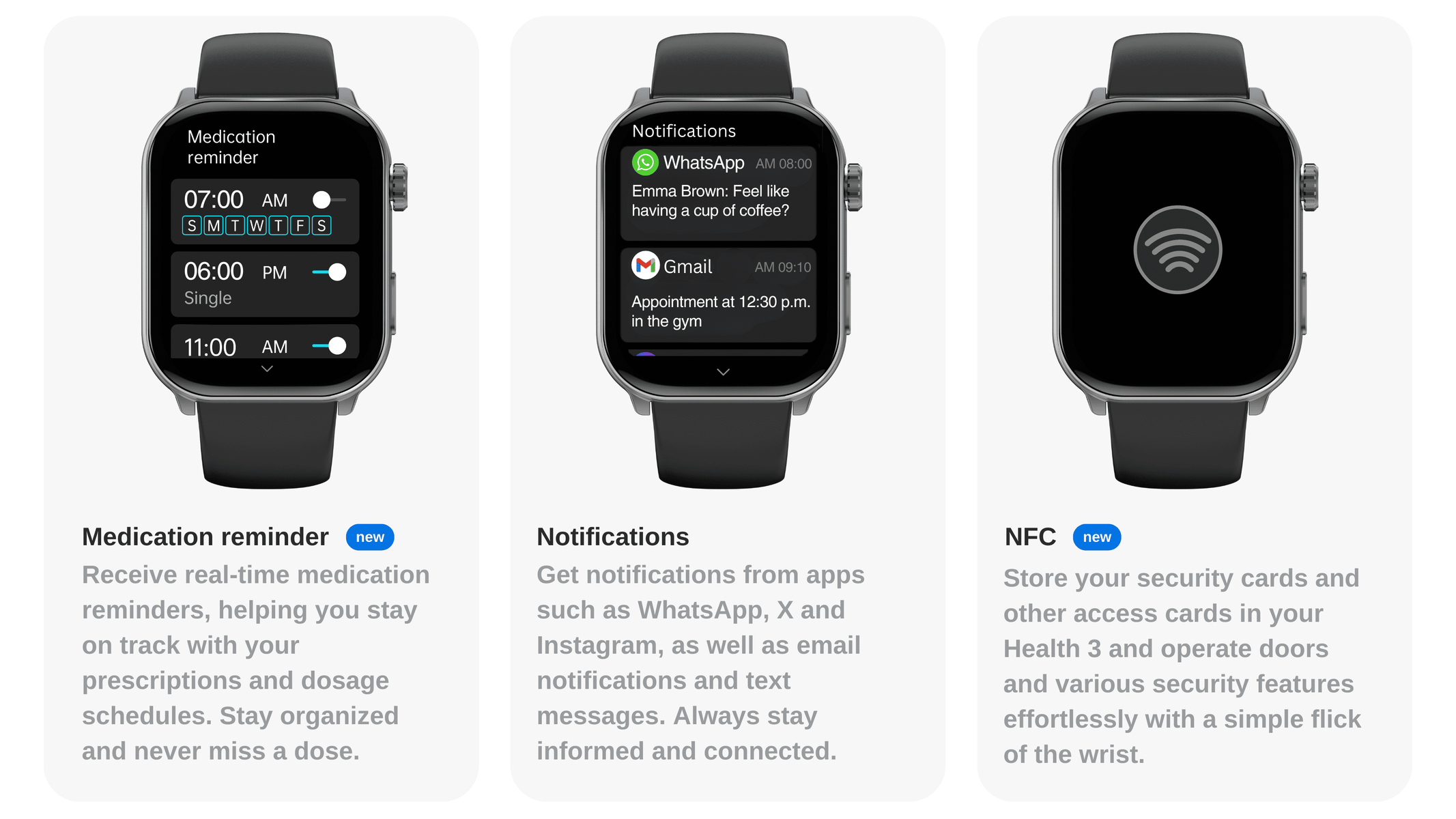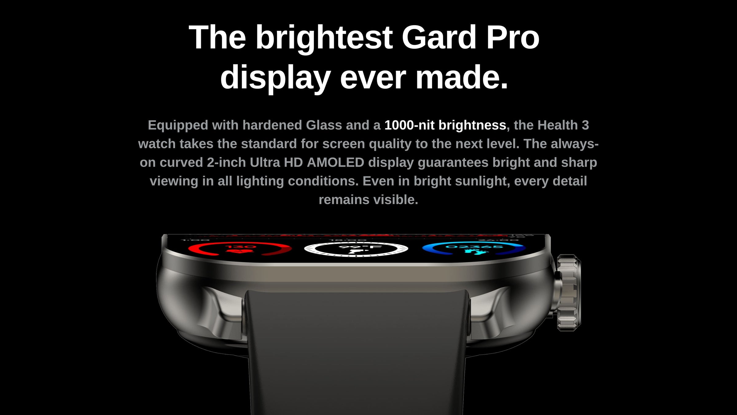 The Health 3 features a largerbrighter 2.06-inch Ultra HD AMOLED display with 1000 nits of brightness, protected by hardened glass for enhanced durability. Health measurement accuracy has improved by 36%, driven by upgraded biometric sensors. Additionally, the device now offers over six new intuitive methods for tracking your health.