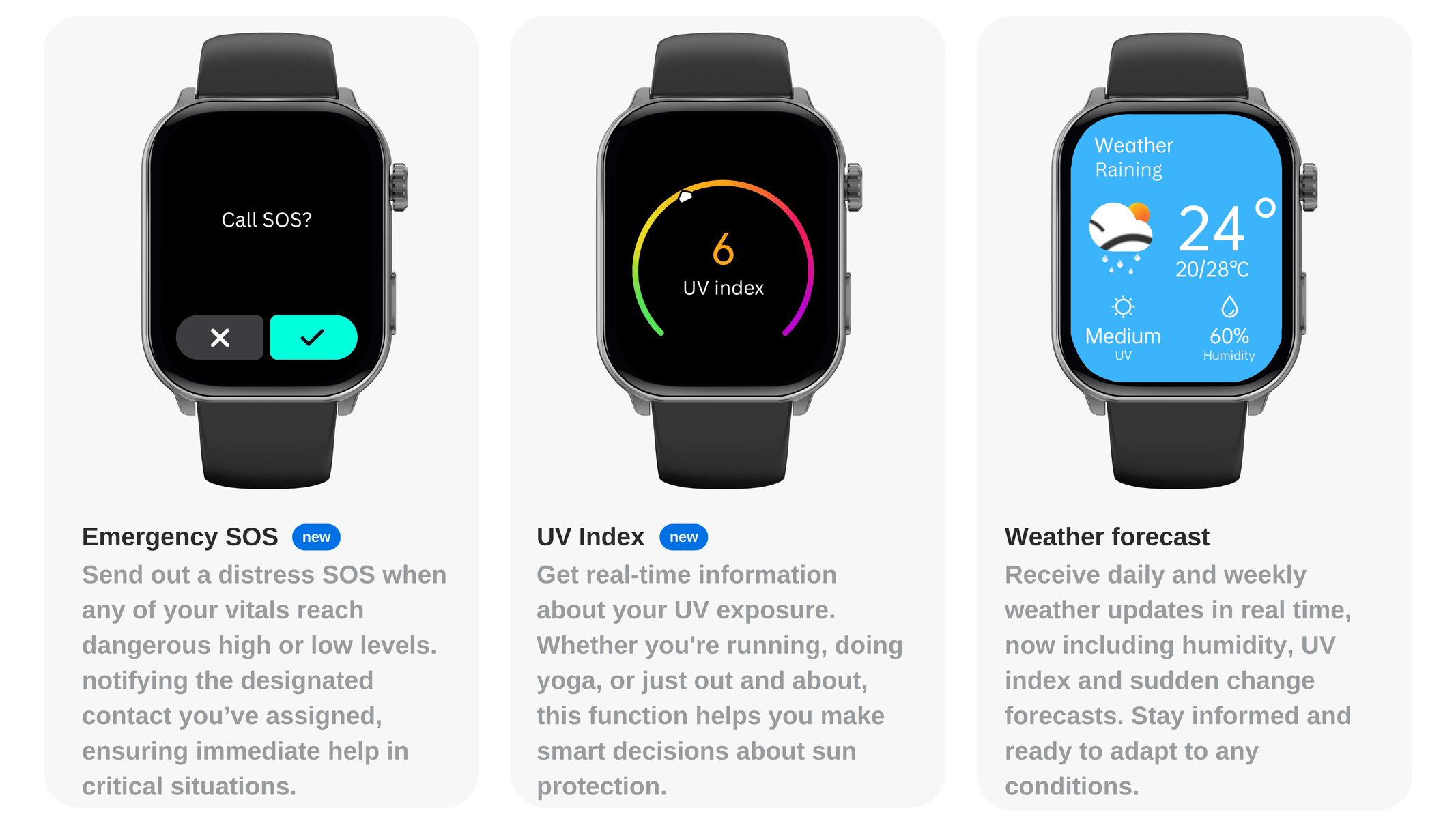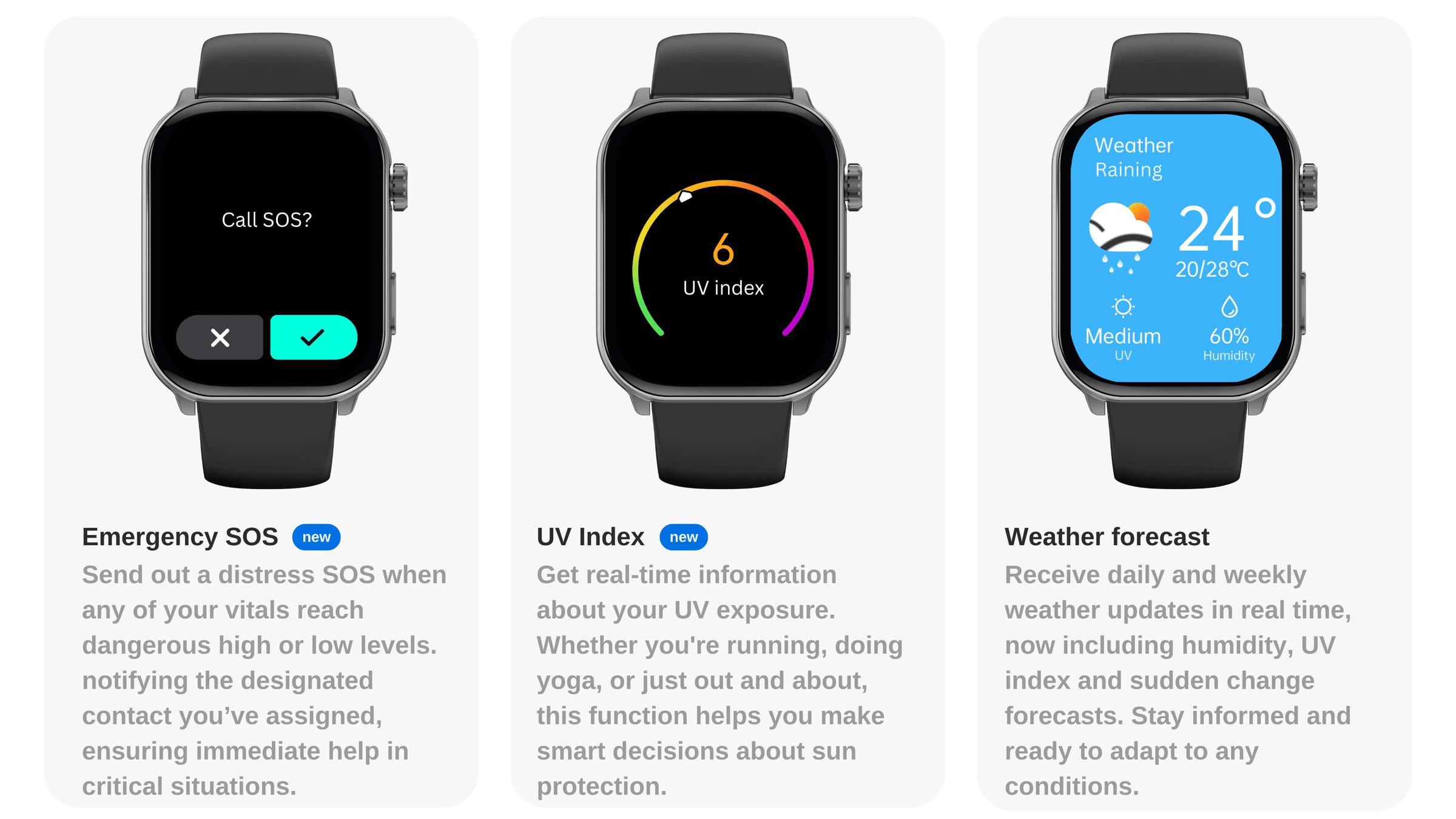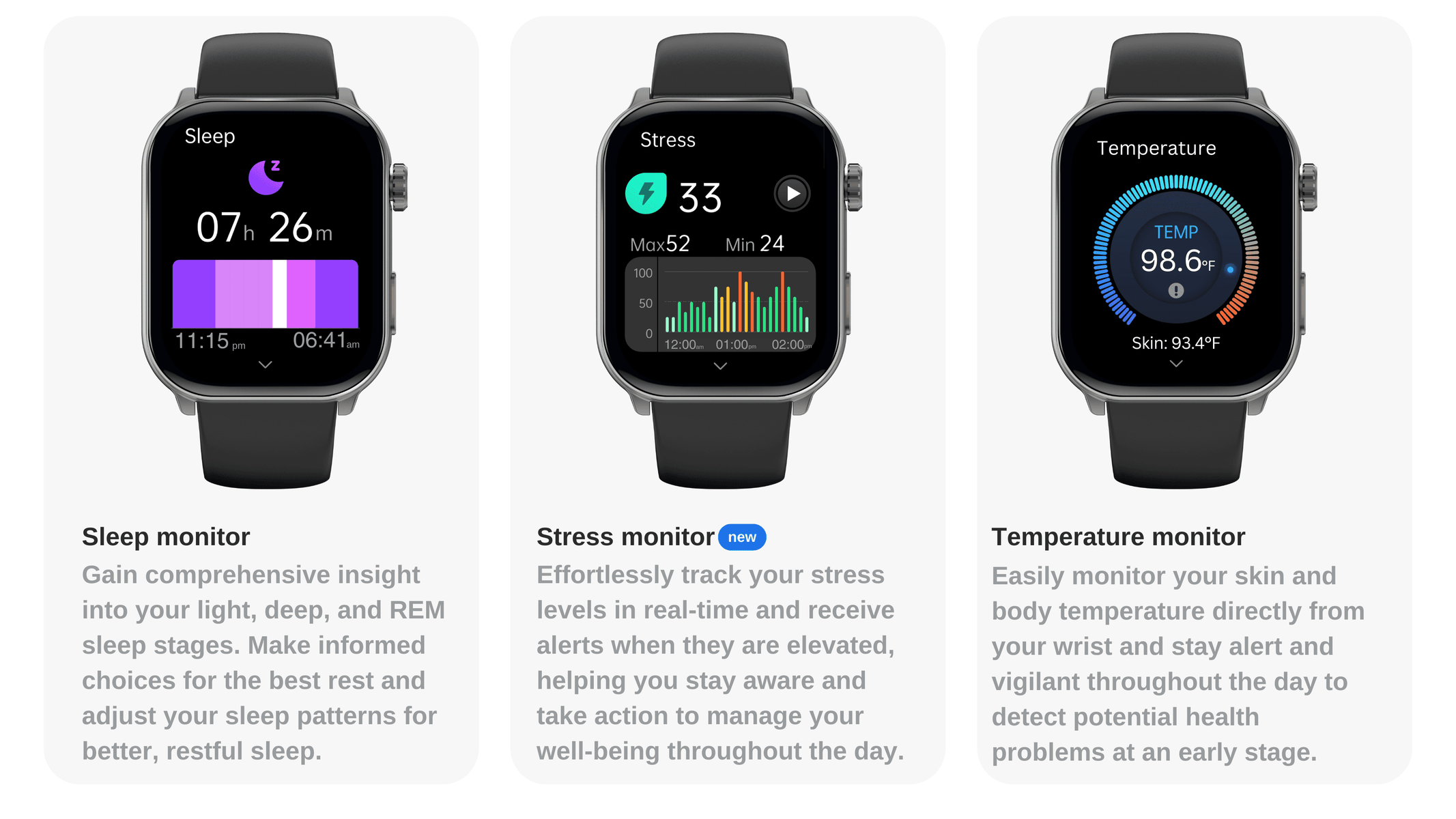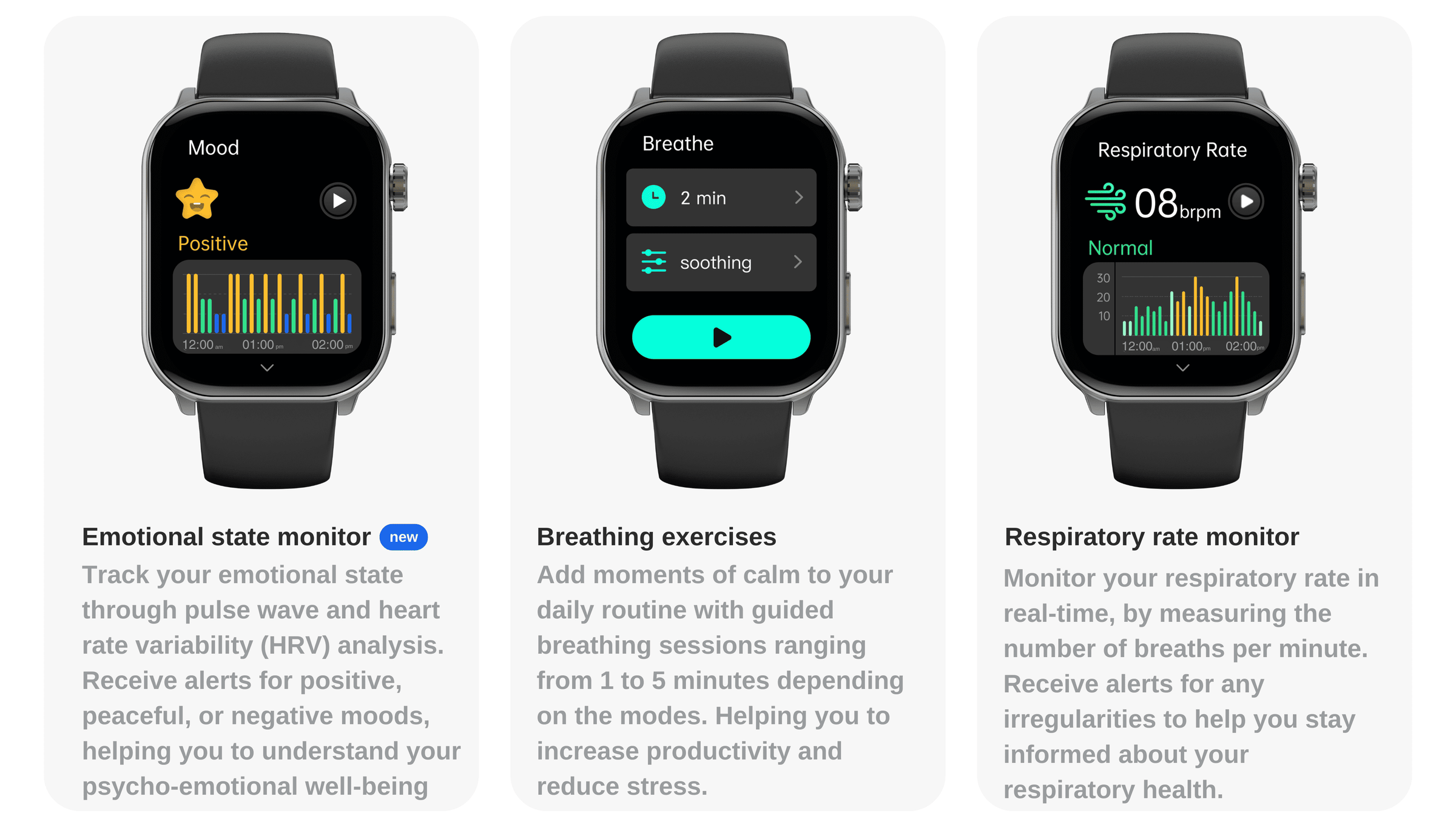 The Health 3 features a largerbrighter 2.06-inch Ultra HD AMOLED display with 1000 nits of brightness, protected by hardened glass for enhanced durability. Health measurement accuracy has improved by 36%, driven by upgraded biometric sensors. Additionally, the device now offers over six new intuitive methods for tracking your health.