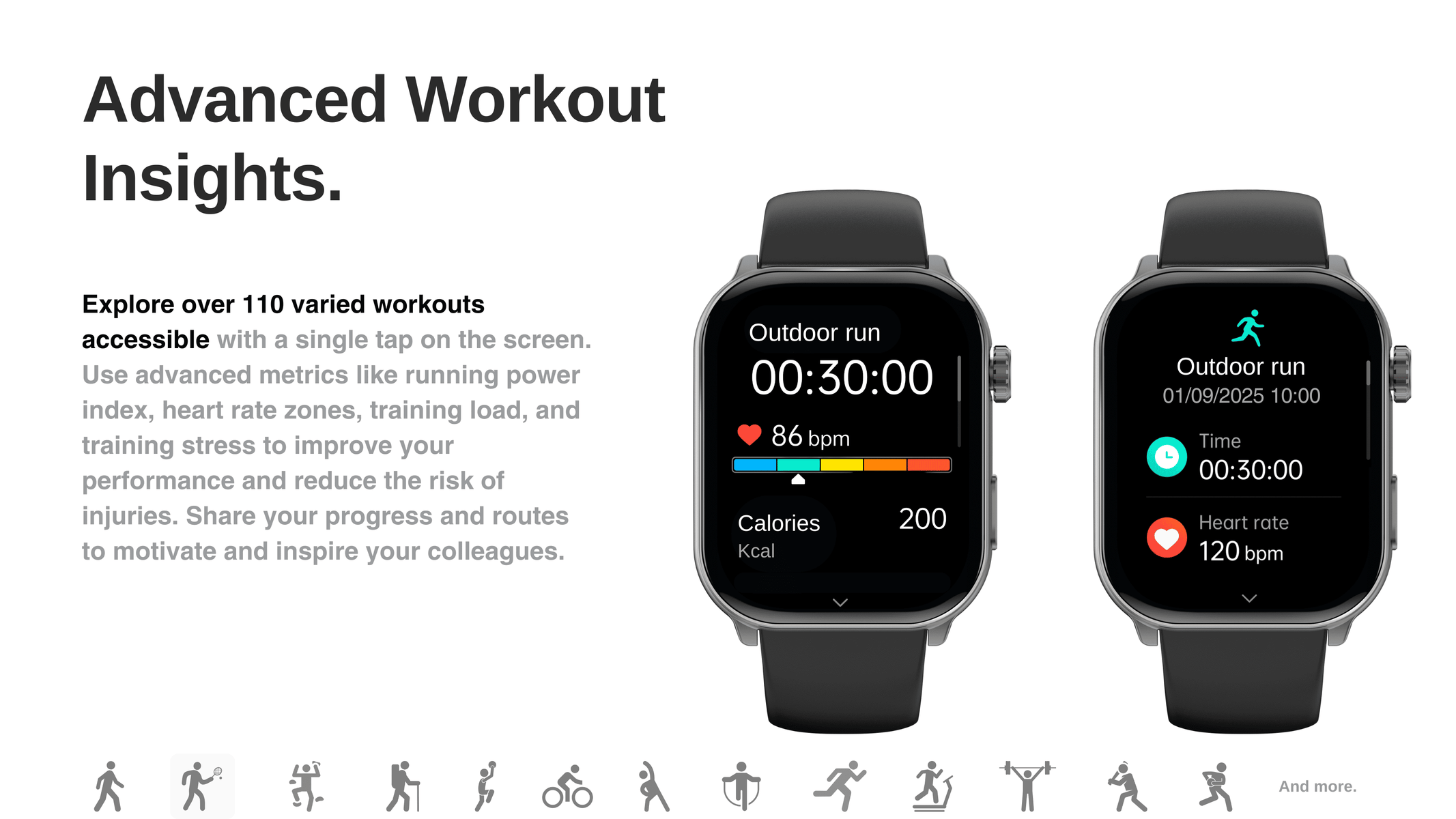 SPORTMODES Outdoor running, Indoor running, Brisk walking, Mountain climbing, Tennis, Basketball, Soccer, Cycling, Yoga, Strength training and more (see full list)